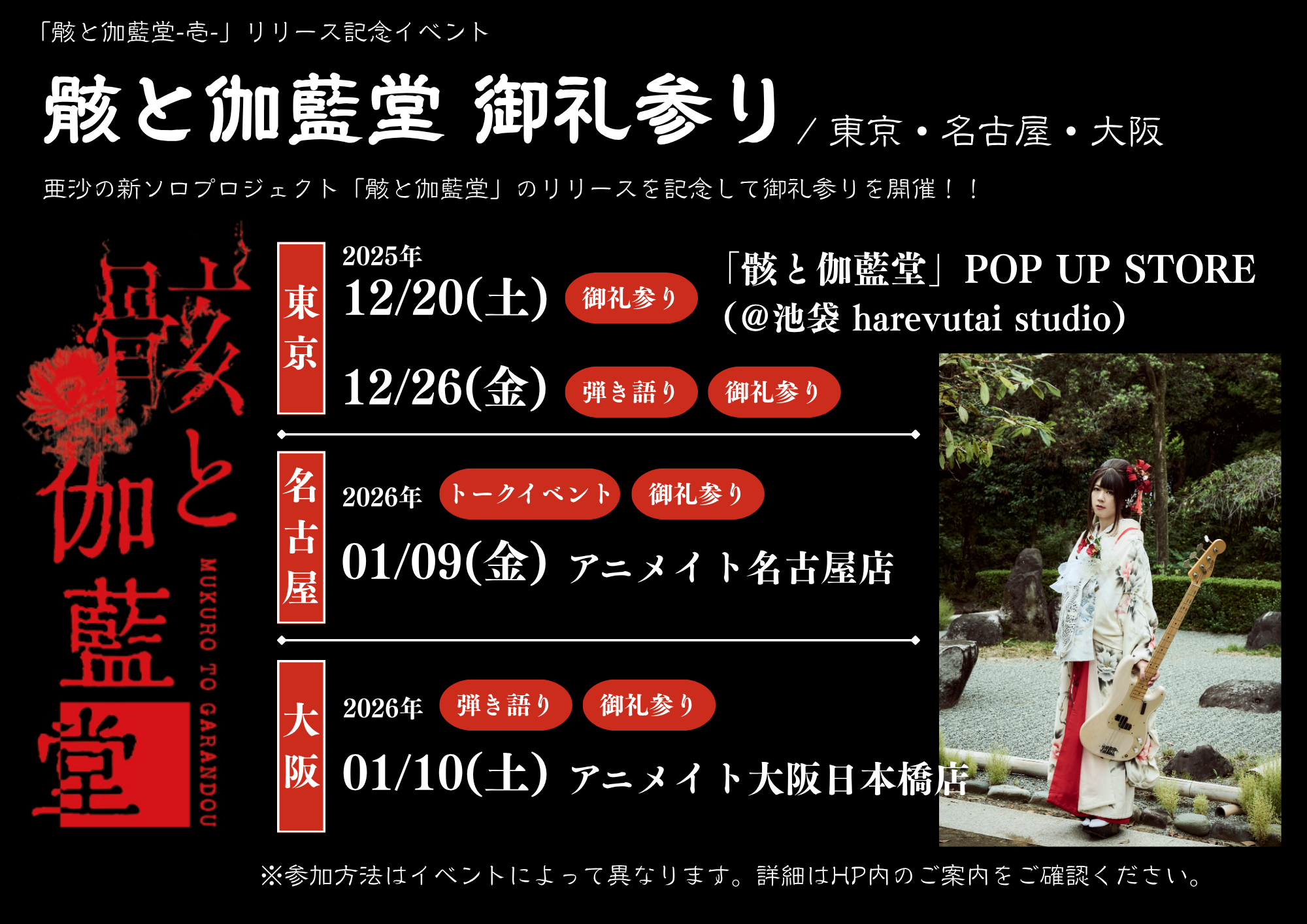 東京・名古屋・大阪にて「骸と伽藍堂 御礼参り」イベントの開催が決定しました!亜沙本人が皆様へ御礼参りさせて頂きます!